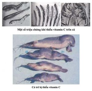 Thiếu vitamin cá sẽ xuất hiện các hiện tượng sau: Thiếu vitamin B1: Cá kém ăn, sinh trưởng chậm, cơ thể không ổn định và mất cân bằng, sủi bọt, da nhợt màu. Thiếu vitamin B2: Thuỷ tinh thể bị đục, thân có màu tối có sự xuất huyết ở da. Thiếu vitamin B5: Thối mang, hoại tử và sẹo, mang ứa nhớt, cá lờ đờ, phản ứng chậm chạp. Thiếu vitamin B6: Rối loạn thần kinh, cá dễ bị kích thích và lồi mắt. Thiếu vitamin B12: Hemoglobin thấp. Hồng cầu dễ vỡ, cá chậm lớn. Thiếu Inositol: Dạ...